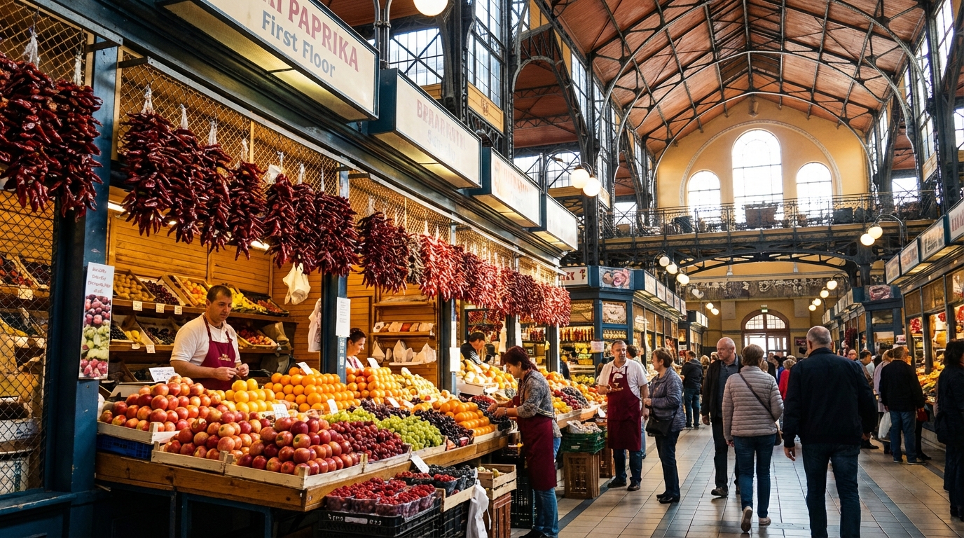 부다페스트 중앙시장 1층 내부에 과일과 파프리카가 진열된 모습