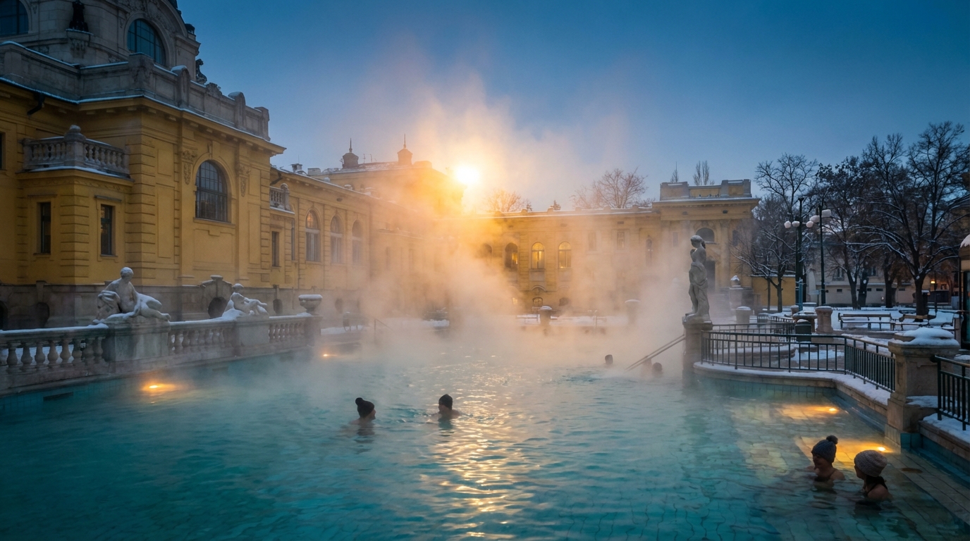 마지막 날은 무조건 온천으로 시작해야 해요. 2박 동안 걸은 다리가 비명을 지르고 있을 거거든요. 세체니 온천이 부다페스트에서 가장 유명하고 규모도 큰데, 오픈 시간(보통 오전 6시)에 맞춰 가면 여유로워요.