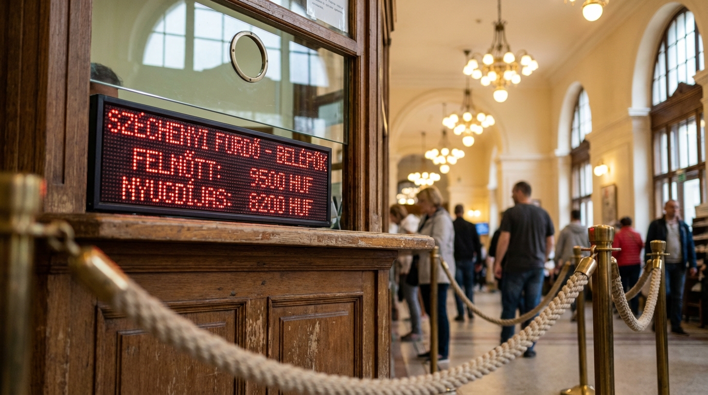 alt="세체니 온천 매표소 현장 티켓 구매 창구와 전광판 가격표"
