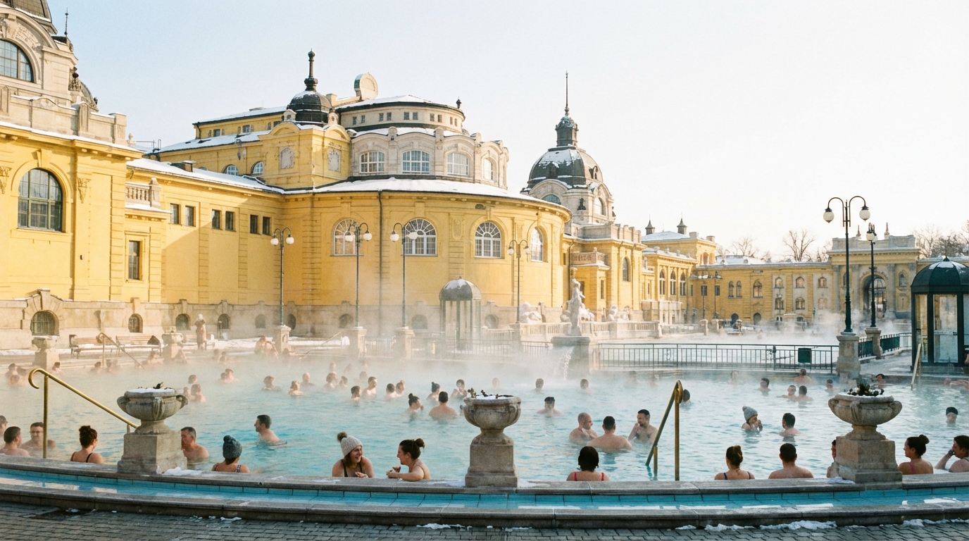 title="겨울철 수증기가 피어오르는 세체니 온천 야외풀 — 1913년 개장한 유럽 최대 규모"