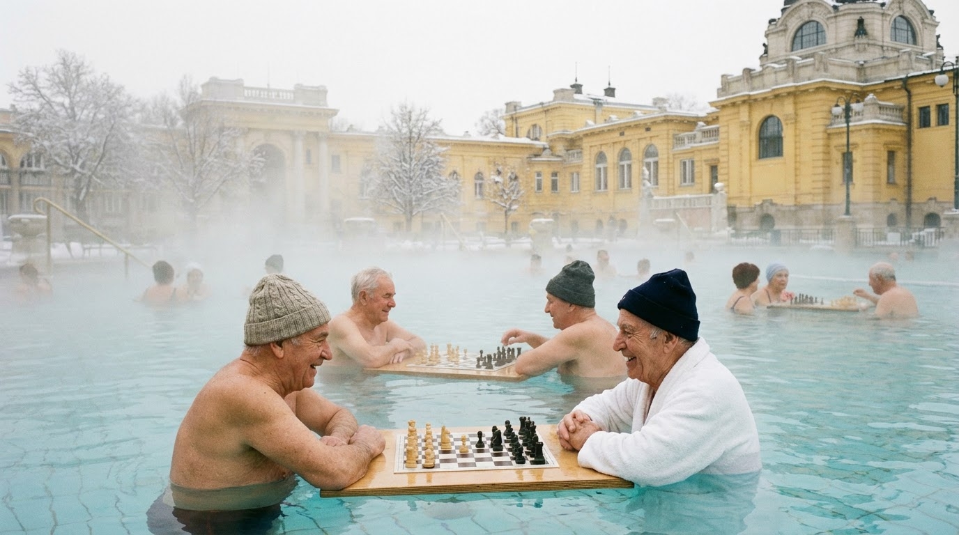 title="세체니 시그니처 장면 — 38도 온천풀 안에서 체스를 즐기는 헝가리 어르신들"
